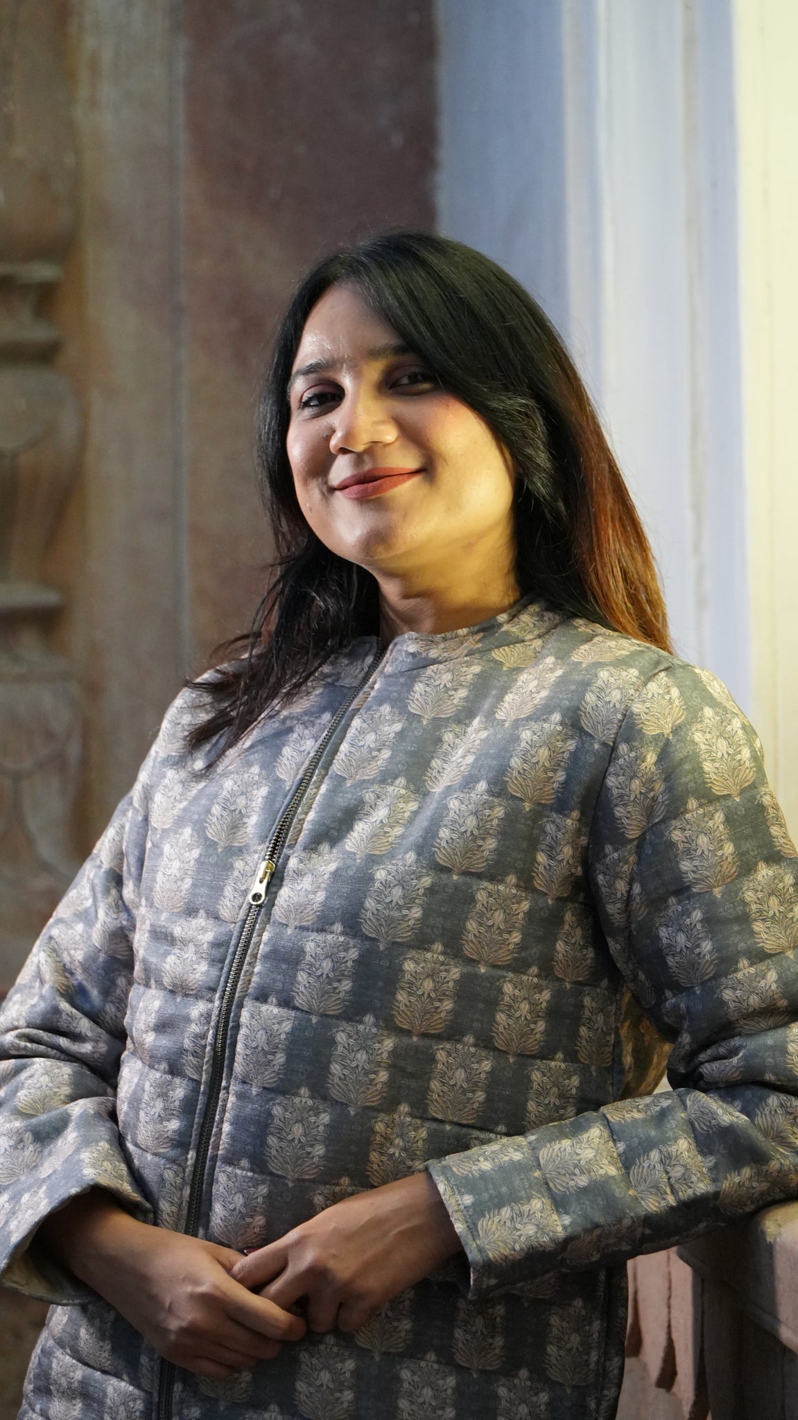 Understated elegance meets everyday warmth. This Sarkara Grey Quilted Jacket features a subtle Jaipuri-inspired floral motif arranged in a soft, geometric pattern—perfect for those who prefer refined style with cultural depth. The muted grey tones make it incredibly versatile, pairing effortlessly with both casual and elevated looks.
